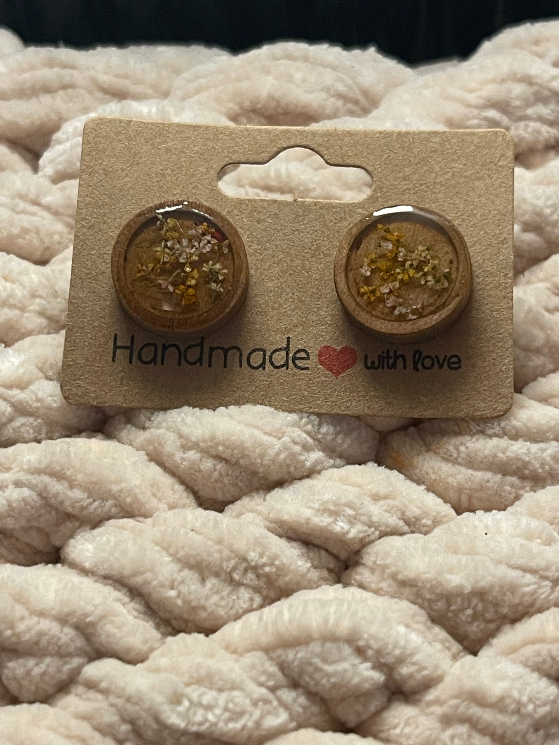 Introducing Garden's Kiss - a unique accessory featuring real dried flowers encased in durable resin on a 12mm wood stud base. Bring a touch of nature to your style and show off your playful side with this quirky piece. (No watering required!)